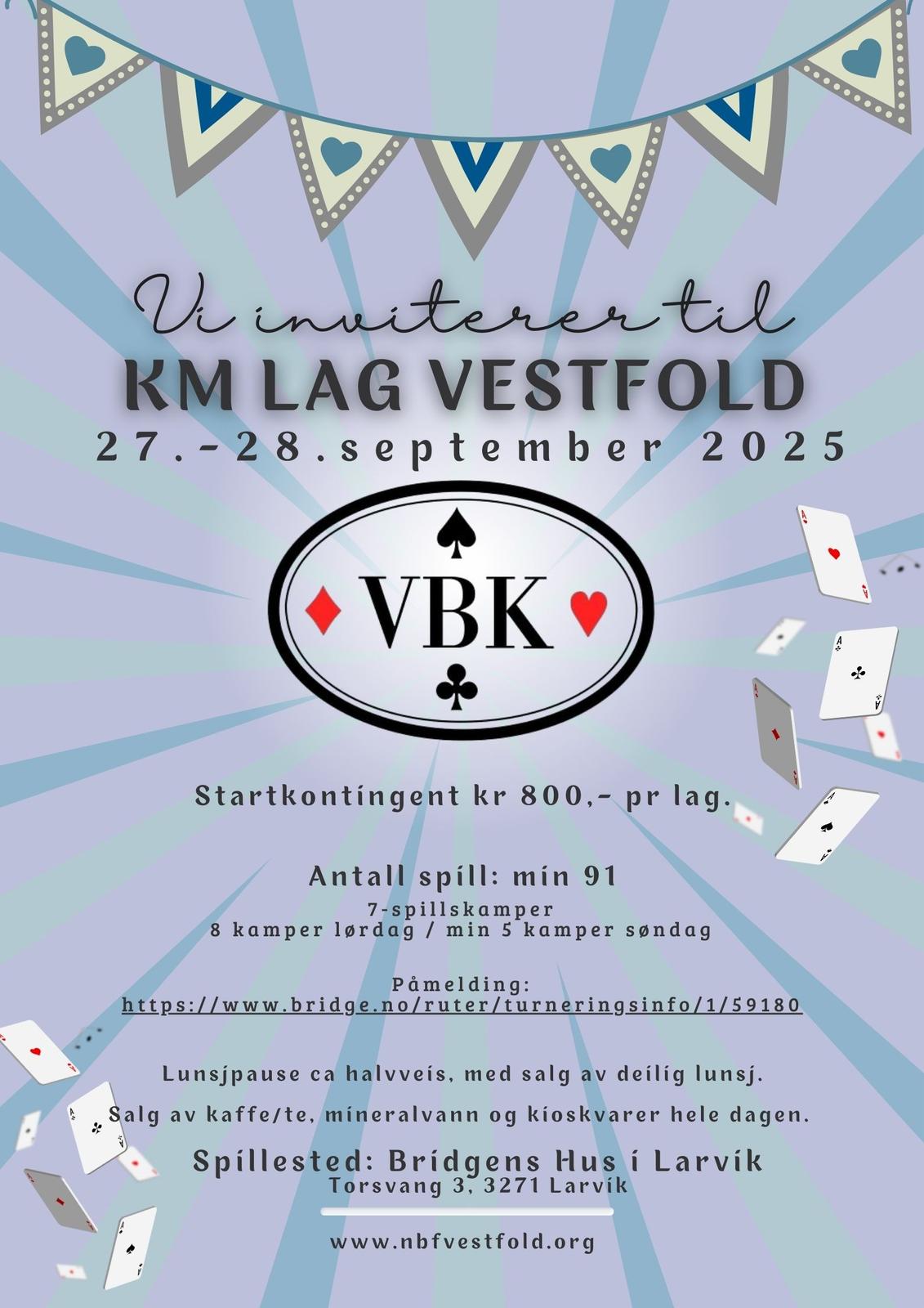 Velkommen til KM Lag i Vestfold 27-28 september, sett sammen ett lag å meld dere på til spilling i Larvik.